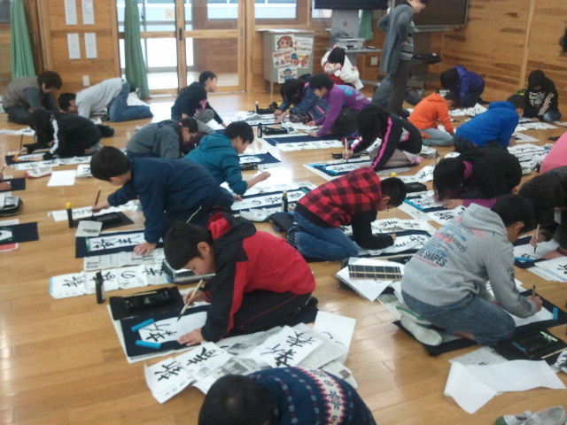 今日は、1・2時間目に2階多目的室で5年生が「書き初め」を行いました。まず、社会人講師の瀧森先生から書き初めの由来を話していただき、この一年の思いを書に託しました。その後、条幅用紙に心を静めて「新春の春」と書きました。それぞれ思い思いに勢いのある字が書けました。