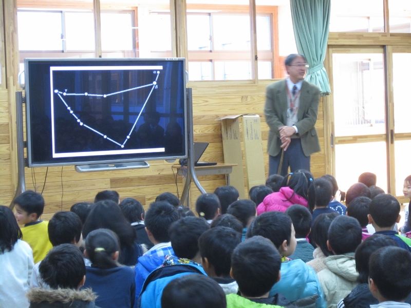 今日は、朝の時間を利用して「全校集会」がありました。今日は、西先生が「黄道十二星座」についてお話しになりました。自分の星座については知っているものの、形やその由来などは知らない児童も多く、子どもたちは電子黒板に釘付けでした。
