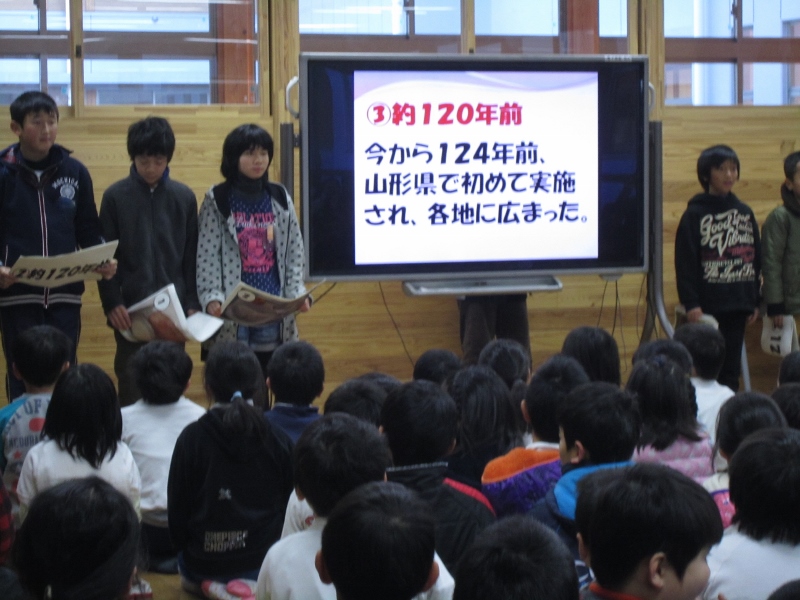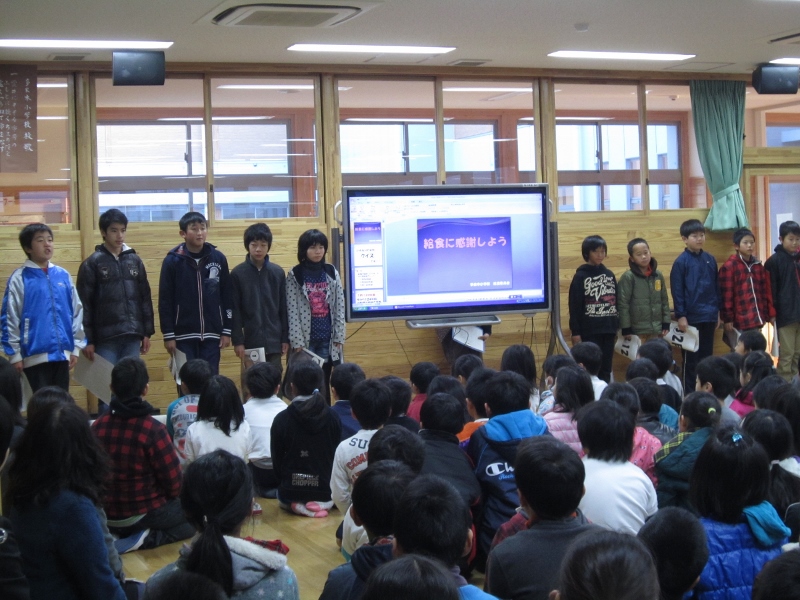 今日は、朝の時間を利用して児童集会がありました。今日は、給食委員会が来週から始まる給食週間にちなんで「給食」のクイズや給食当番の際に注意することなどを分かりやすく発表してくれました。給食に感謝して食べて欲しいと思います。