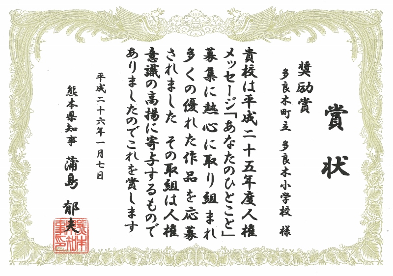 今日は、うれしい話題をもう一つ。このたび、多良木っ子の頑張りが認められ、「体力向上優良校」と「人権メッセージ奨励賞」という形で賞状をいただきました。これからもいろいろな形で頑張って欲しいと思います。