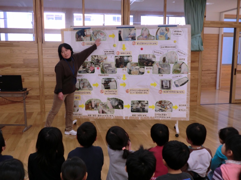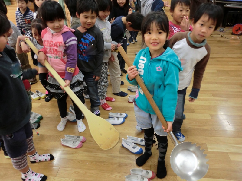 今日は、5時間目、1年生が、栄養教諭の吉開先生をお招きして、「給食センターの一日の仕事」についてお話をしていただきました。写真を使って説明をされ、その中で出てきたセンターで使用している大きな「しゃもじ」や「おたま」を実際に手にした児童たちは大喜び!「残菜ゼロの時が一番うれしいです。」との言葉に、残さずに食べることを約束した子どもたちでした。