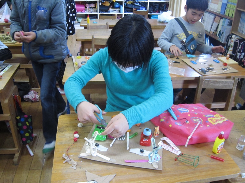 今日は、4年生は5,6間目が図工の時間でした。不要品(壊れたおもちゃや使わなくなったスプーンなど)を使ってお面を作っていました。ロボットみたいなお面がたくさん出来上がっていました。2月7日から開催される人吉球磨小中学校工作展の出品作品になるようです。
