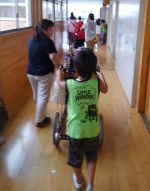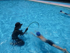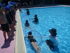雨が続き、なかなかプールができなかった1年生です。約1週間ぶりのプールに大喜びでした。今日は、わにさん歩きでフープをくぐる練習をしました。顔をつけながら進み、最後まで顔を拭かずに頑張る姿が格好良かったです。これからは、力を抜いて水に浮かぶ練習も、1年生みんなで頑張っていきたいと思います。