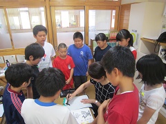 はじめの会では、歌「どんな人が好きですか」を一緒に歌い、グループに分かれての自己紹介や魚釣りゲームをしました。最初は緊張していましたが、学校を案内して体育館に戻ってきた頃には・・・各グループ輪になって、質問タイムで盛り上がっていました。球磨支援学校の友だちと、楽しく、充実した時間を過ごすことができました。
