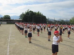 今年度初めての体力アップタイムがありました。体力アップタイムとは、1ヶ月に1度のペースで、全校児童が集まり、ラジオ体操やランニングを行う取組です。1学期はラジオ体操を中心に、子どもたちの体力向上を目指した取組を行っていきます。肘や膝をしっかり伸ばしたり、腰から大きく動かしたりすると、ラジオ体操でも軽く息が切れる心地よい運動になります。朝から気持ちの良いスタートを切ることができました。