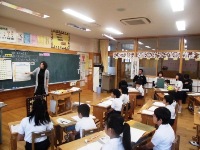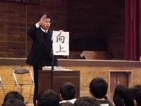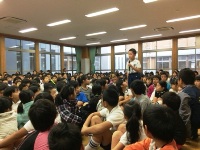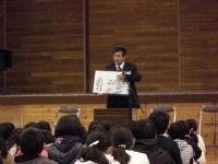 今日はワールド集会があり、インドネシアの日本人学校に勤務されていた御経験のある佐藤先生をお呼びして、インドネシアの文化について講話をしていただきました。佐藤先生は、「国際理解のためには、違いを知り、認め、受け入れることが大切」と話され、日本の文化との違いを紹介してくださいました。衣服や交通など、日本とは違う文化を知ることができ、驚きながら興味をもって聞いていた子ども達でした。