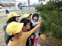 今日は、1年生が生活科の学習で学校内を見て回り、冬探しをしていました。子ども達は地面や木の様子をよく見て、葉が枯れていることや、枝に小さなつぼみがあることなどを見つけていました。松の木では雌花や雄花を見つけ、「松ぼっくりの赤ちゃんだ!」と嬉しそうに話していました。