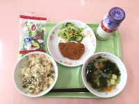 今日の給食は、旬の「たけのこ」をふんだんに使った献立です。たけのこは今の時期が一番おいしいとき。そんな時期を食べ物の「旬」といいます。特に、生の新鮮なたけのこは、今しか食べられないのでその香りや歯ごたえをよく味わって食べてください。今日は、球磨産の筍を使って「山菜おこわ」と「若竹汁」を作りました。若竹汁は名前の通り、わかめとたけのこを使って作ったお吸い物です。今日の給食もよく噛んで残さず食べてくださいね。