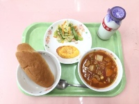 今日の給食には「野菜のカレー煮」があります。鶏肉、じゃがいも、にんじん、ごぼう、れんこんなどたくさんの具材が入っていて栄養満点です。味付けもカレー味になっているので食べやすいと思います。今日の給食もよく噛んで残さず食べましょう。