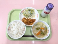牛乳、麦ご飯、坦々味噌汁、鶏の唐揚げ、ビーフンの酢の物