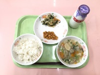 先日から続いている地震の影響で、今日の給食に使う予定だった小松菜が入荷できなかったため、献立を一部変更しています。「小松菜とひじきの和え物」から「ほうれん草とひじきの和え物」になりました。