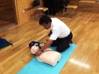 その後、胸骨圧迫と人工呼吸、AEDの使い方を、人形を使って実際に行いながら確認しました。