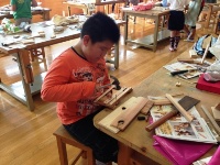 今日は、4年生が図工の学習で、のこぎりを使って製作をしていました。はじめに、刃を入れる角度や引く速さなど、切る段階によってのこぎりの扱い方が違うことを教わっていました。その後、教わったことを意識しながら、慎重に木の板の切断に挑戦していました。集中して製作に取り組み、道具の扱い方になれることができていたと思います。