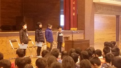 朝の時間に児童集会を行いました。全員で、今月の歌を歌った後、美化委員会の発表がありました。掃除前に行っている「黙想」について、なぜ行っているかを例を示したり、実際の様子を映像で見てもらったりして、意味を説明してくれました。最後に、感想交流では「しっかりと黙想をして、自分を高めていきたいと思いました。」などがありました。