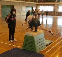 5年生の体育は、跳び箱の学習を行っています。かかえ込み跳び(閉脚跳び)や台上前転などの新しい技の習得を目指して練習します。
