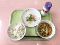 牛乳、麦ご飯、カレーうどん、しんじゃがとアスパラのねりごま和え