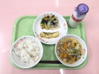 牛乳、麦ご飯、ピリ辛汁ビーフン、ちぐさ焼き、トマトとこんにゃくのサラダ