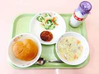 今日の給食には「セルフバーガー」があります。パンの間にハンバーグやサラダをはさんで食べてください。今日の給食もよく噛んで残さず食べてくださいね。