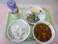 牛乳、麦ご飯、チキンカレーの具、れんこんサラダ、りんご
