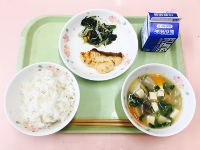 麦ごはん、牛乳、けんちん汁、魚の西京焼き、ほうれん草ののりごま和え