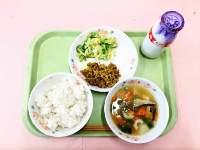 牛乳、麦ご飯、のっぺい汁、豚肉のカレー風味焼き、ごまネーズ和え