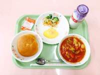 牛乳、米粉パン、ポークビーンズ、トマトオムレツ、ツナサラダ、ミルメーク