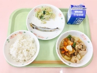 麦ごはん、牛乳、筑前煮、焼きししゃも、キャベツのおかか和え