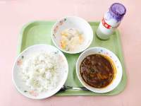 今日はみなさんに人気のカレーです。豚肉を使ってポークカレーを作りました。カレーを作る時は、玉ねぎがあめ色になるまで20分間炒めます。大きな釜でたくさんの玉ねぎを炒めるのは大変な作業ですが、みなさんにおいしく食べてもらえるよう、調理員さんもがんばっています。おいしく出来上がっていると思うので、よく噛んで残さず食べてくださいね。