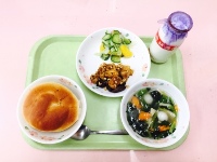 牛乳、チャーハン、ワンタンスープ、チキンメンチカツ、こんにゃくサラダ