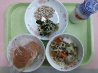 牛乳、ロールパン、しっぽくうどん、ほうれんそうのゴマ和え、大豆のりんかけ