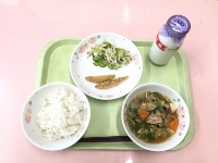 牛乳、麦ご飯、すき焼き、きびなごのカリカリフライ、かみかみするめ和え