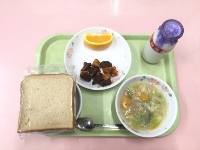 牛乳、黒糖パン、野菜スープ、ポテトとレバーのケチャップ和え、オレンジ