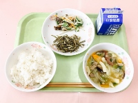 今日の給食には「中華丼」があります。中華丼の具をごはんにかけて食べましょう。たけのこやれんこんなど、食感のよい野菜をたくさん使っていますので、よく噛んで食べてください。