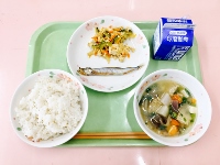 麦ごはん、牛乳、けんちん汁、焼きししゃも、ゴーヤチャンプルー