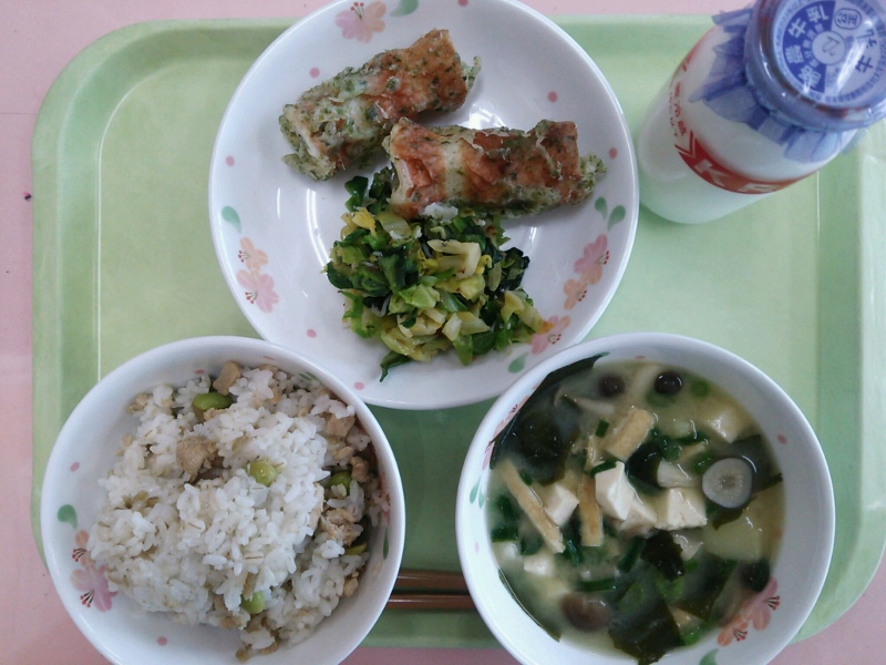 牛乳、鶏めし、じゃがいもの味噌汁、ちくわのいそべ揚げ、キャベツのおかか和え