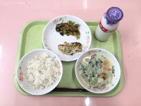 牛乳、麦ご飯、豆乳豚汁、ホキのもみじ焼き、小松菜のおひたし