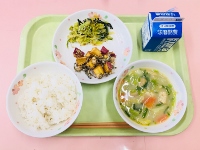 麦ごはん、牛乳、みそつみれ汁、ミックスかりんとう、キャベツのおかか和え