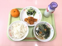 牛乳、麦ご飯、キノコとわかめのスープ、魚のチリソース、小松菜と大根の中華和え、みかん