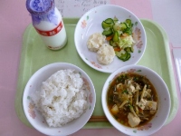 牛乳、麦ご飯、マーボー豆腐、えびシューマイ、キャベツのナムル