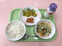 牛乳、麦ご飯、冬瓜スープ、タンドリーチキン、みかんときゅうりのサラダ
