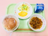 米粉パン、牛乳、スパゲティミートソース、オムレツ、キャベツとコーンのサラダ