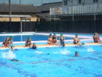 また、今日は保護者や地域の方に子どもたちの学習の様子を見に来ていただく「行こうデー」でした。ほとんどの学年は、プール開きを兼ねて行いました。暑い毎日が続く中、子どもたちはこの日を心待ちにしていました。新しくできた綺麗なプールに入ると、冷たい水の中で気もちよさそうに泳ぐ子どもたちでした。