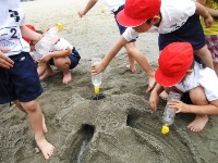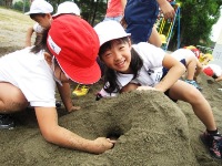 今日は、1年生が生活科の時間に砂場で砂遊びをしていました。砂を集めて大きな山にし、そこに穴を掘ってトンネルをつくったり、山に水を流して川をつくったりして遊びました。子どもたちは友達と協力して熱心に取り組みながら、砂の感触などのおもしろさを味わうことができていました。