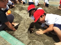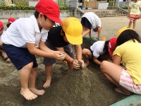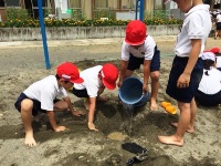 今日は、1年生が生活科の学習で砂遊びをしていました。子ども達は、砂を高く積んで山をつくったり、穴を深く掘ったりしていました。学習の後半では水を流して川や池をつくり、水や泥の感覚を味わいながら楽しく活動することができたようです。