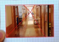 6年生は、本日5、6時間目の図工の学習で「思い出の場所を描く」学習をしました。この学習では、風景の奥行きを捉え、表現できるようになるために、「一点透視図法」を学習しました。写真にあるように、まず画用紙で枠(フレーミングガイド)をつくり、そこから覗き、構図(フレーミング)を捉える活動をしました。この枠が画用紙の縁にあたり、枠のどこから風景の線が出ているかを見て、それを画用紙に描くのです。