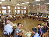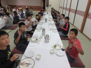 9月から多良木町のALTになったルーシー先生と5・6年生が外国語学習を行いました。高学年との学習は今日が初めてだったので、始めはルーシー先生の自己紹介や出身地についてのお話をしてくださいました。出身の町や食べ物などの話に興味津々の子どもたちでした。6年1組で一緒に給食を食べました。