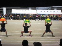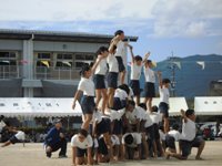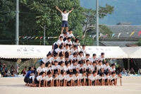 運動会の最後を飾るのは、高学年による組体操です。今年は熊本地震の復興に頑張るふるさと熊本に、元気をあげたい!という目標に向かって頑張りました。これまでの練習で頑張ってきたという自信を胸に、子どもたちは一片の迷いもない凛々しい表情で、精一杯の演技を見せてくれました。自信に満ち溢れ、全く揺るがない7段ピラミッドをつくることができました。終わった後、成功した喜びに涙を流す子どもたちの姿に見ている方も胸が熱くなりました。「やればできる」ということを子どもたちに教えてもらった組体操でした。