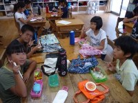 まず、のこぎりを使って竹を適当な長さに切り、その後、砂できれいに磨きました。子どもたちは、自分たちが使用する道具ということもあって、真剣にそして丁寧に作業に取り組みました。