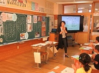 9月から多良木町のALTになったルーシー先生と5・6年生が外国語学習を行いました。高学年との学習は今日が初めてだったので、始めはルーシー先生の自己紹介や出身地についてのお話をしてくださいました。出身の町や食べ物などの話に興味津々の子どもたちでした。6年1組で一緒に給食を食べました。