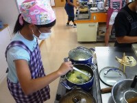 家庭では炊飯器で炊くことが多いごはんですが、今回は中の様子が見える鍋を使って、火加減を調節しながら調理をしました。時間や火加減に気をつけながら、真剣なまなざしで調理に取り組んでいました。